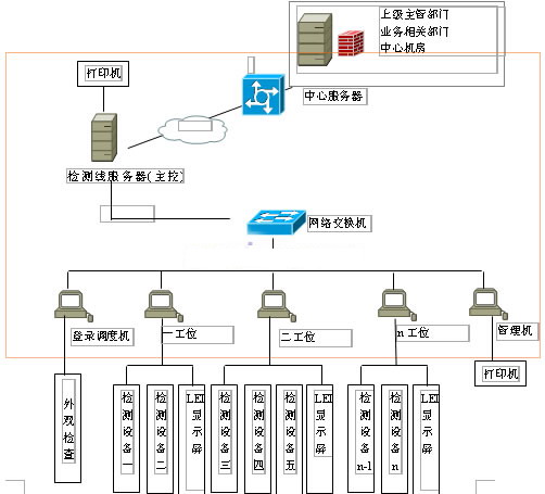 计算机联网检测系统以检测线服务器为中心构成检测站局域网实现线内资源共享,同时与上级主管部门及相关业务部门连成广域网,以实现信息的共享与职能的监管。目前常用的网络结构为星型拓朴结构,网络操作系统多采用Windows 2000 Server,而数据库平台则常见Oracle、Microsoft SQL Server2000等大型关系数据库。