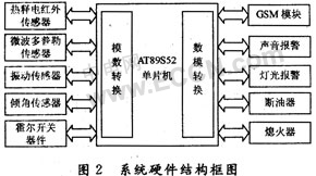 系统硬件结构框图如图2所示,由传感器单元电路、单片机AT89S52电路、GSM模块通信电路、声音灯光报警电路、断油断电控制电路等组成,并由固态继电器控制具体操作设备。